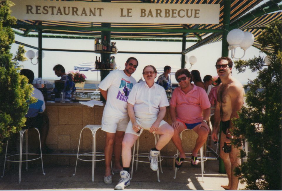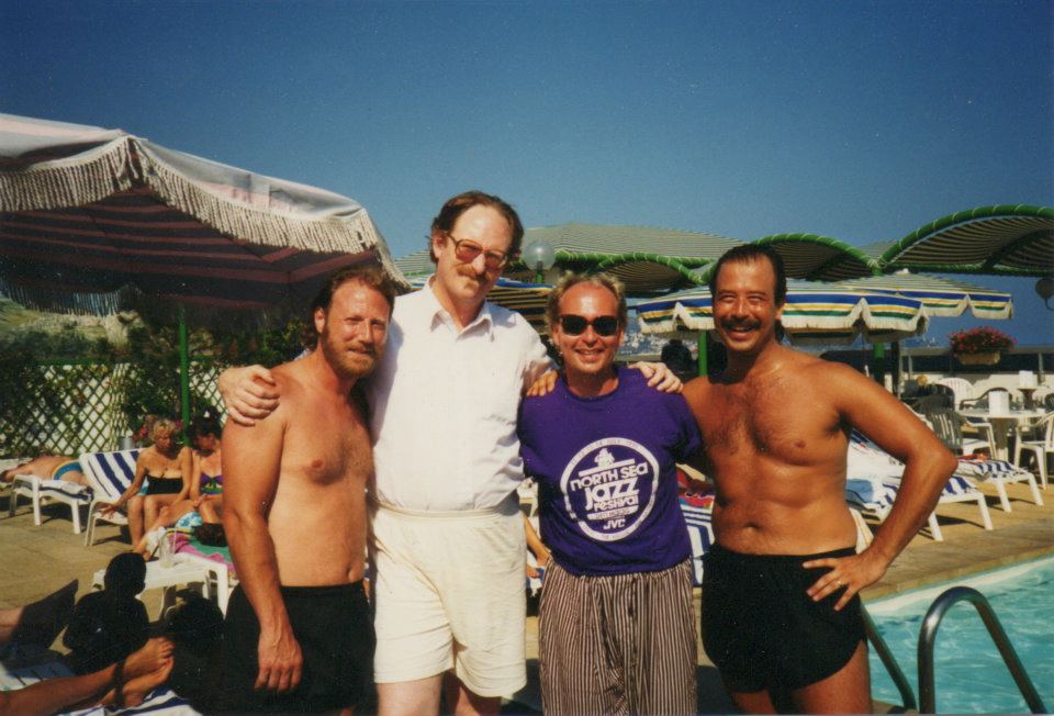 左からDonald" Duck" Dunn、Alan Rubin "Mister Fabulous" と見知らぬ男. 後ろのバーにSteve CropperとMichelle Zarin.